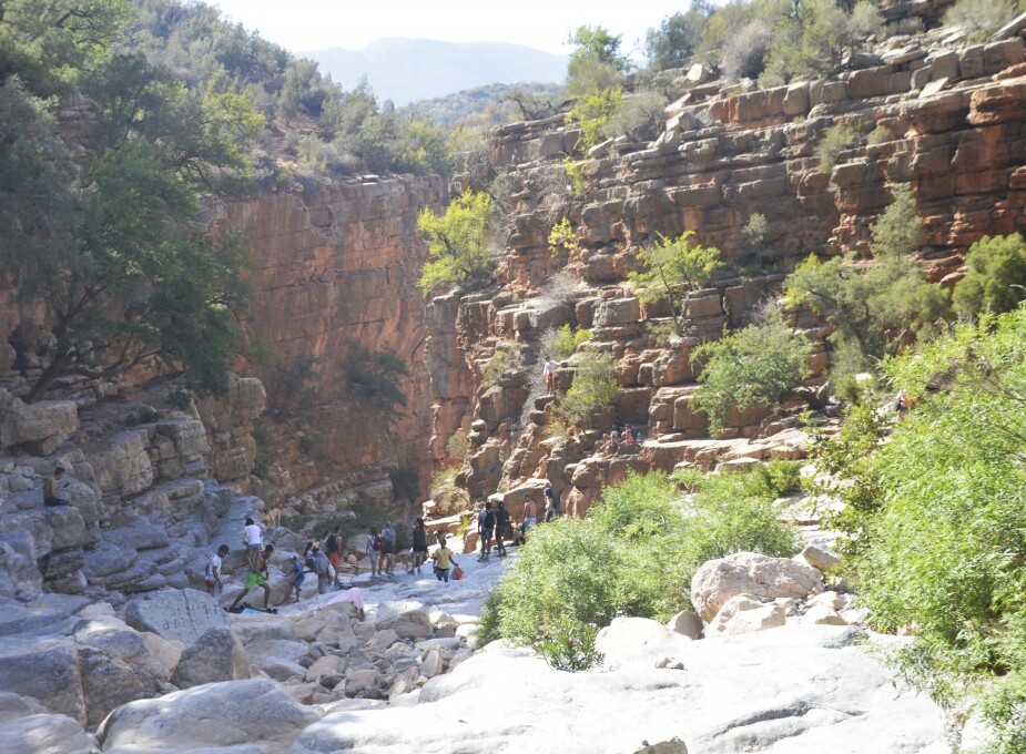 Départ à 09h00 ou 14h00 en direction du nord d'Agadir, en passant par le village des bananes après un court trajet en voiture et en empruntant la magnifique route du miel ; la route est si jolie avec des palmiers, des lauriers roses, des oliviers, des piscines naturelles, et des étangs creusés dans la roche dure tout le long des gorges qui atteignent parfois les 180 m de hauteur. Une belle scène, des arrêts sont prévus pour des photos à volonté. Continuez le voyage mais cette fois en quittant la vallée et en traversant les montagnes du Haut Atlas à 1100 m d'altitude, une vue incroyable et magnifique avec des maisons berbères perchées sur les rochers et les falaises. Une pause thé à la menthe est prévue avec une famille berbère, pour se faire une idée du mode de vie traditionnel des habitants, la cérémonie du thé est accompagnée de pain frais fait maison cuit au four traditionnel (Tafarnoute) accompagné de miel de thym et d'huile d'argan. .. (La pause chez la famille berbère est facultative et dépend de la préférence du visiteur) attendez-vous à un pourboire pour votre hôte.